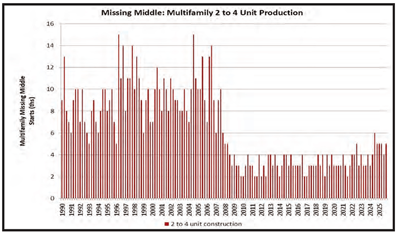 Although not a huge jump, 2025 featured the highest construction volume for multifamily missing middle housing starts since 2007. The missing middle construction sector includes development of medium-density housing, such as townhouses, duplexes and other small multifamily properties.